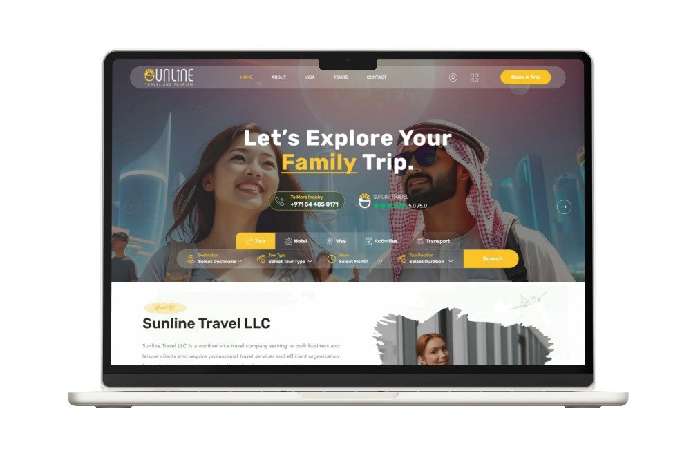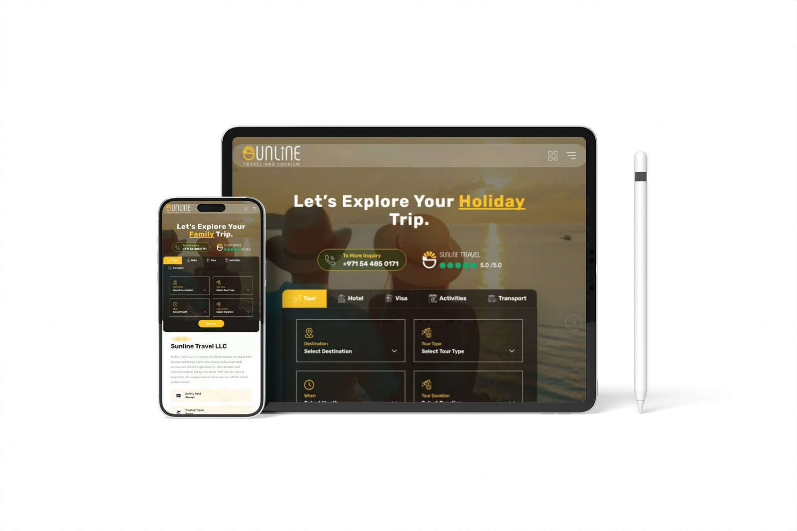 Sunline Travel is a Dubai-based travel and tourism company for which Fusion Design Agency developed a modern, fully responsive website. The platform was designed to streamline online bookings for travel tickets, tours, hotel accommodations, and visa services, delivering a seamless, user-friendly experience across all devices.
